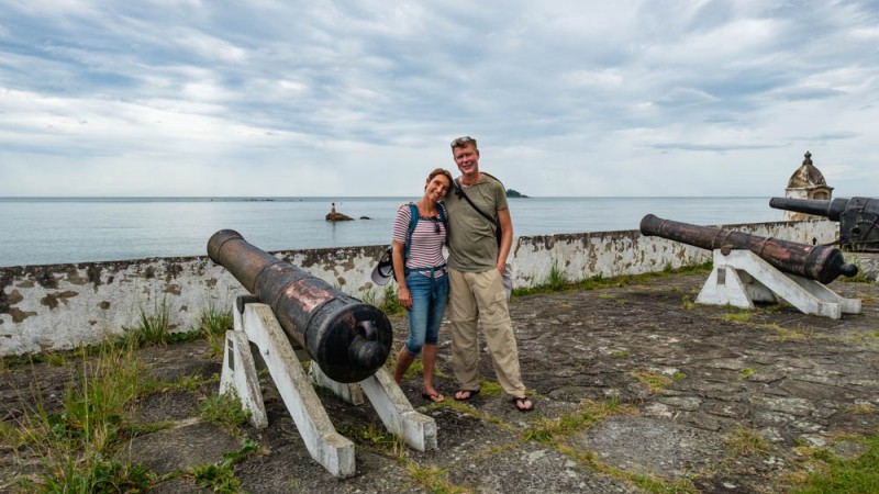 Inspired by this, we decided to spend a couple of days on one of the islands on our way back to Rio despite the not so fantastic weather forecast. You have seen most of the old colonial towns in a couple of hours and if the weather does not cooperate you’re done pretty quickly. On an island you have more opportunities to entertain yourself. We started our drive back north from Floripa and, with a stopover in Paranaguá to visit the historic center, took the ferry to Ilha do Mel.Ilha do Mel is also a car-free island and looks a bit like Ilha Grande. It is a little smaller, less touristy and therefore a lot more pleasant. It turned out to be a good choice for another reason as well: while dark clouds formed above the mainland, we had some wonderful days with lots of sun. Our pousada offered a brilliant service: if you want to go to the beach, you just take a few chairs and a parasol, put them on a handy trolley that can also serve as a table. The hot sun is less fun if you decide to make a hiking trip across the island. Especially if you take a wrong turn somewhere. But that’s when you have the opportunity to discover a few other beautiful beaches. On the last day we sailed around the island with a boat, visiting the old fort, Fortaleza de Nossa Senhora dos Prazeres, and spotted dolphins (golfinhos).